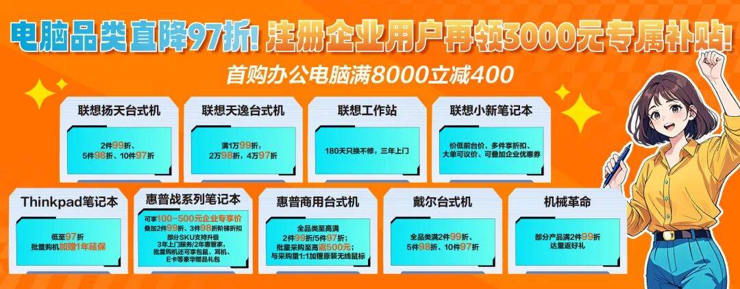 更让人破防的是做PPT:找模板、排版、写纲领……好不容易有灵感,收集一卡,素材加载不出来,刚做的内容没保留,间接消逝。 ThinkPad T14p AI PC工程师本:搭载酷睿Ultra9处置器,算力高达99 TOPS,专业级机能超卓,轻松应对开辟取虚拟化使命。平台优惠包罗低至97折,批量采购加赠1年延保。 正在各品牌上都有优惠权益,Thinkpad笔记本:低至97折,批量购机加赠1年延保、联想小新笔记本:价低前台价、多件享扣头、大单可议价、可叠加企业优惠券,惠普和系列笔记本:可享100-500元企业专享价,叠加2件99折、3件98折阶梯扣头,部门SKU支撑升级3上门办事/2年惠管家,批量购机还可享包鼠、、E卡等奢华赠品礼包,机械:部门产物满2件99折,达量返好礼。联想扬露台式机:2件9。9折、5件9。8折、10件9。7折,联想天逸台式机:满1万99折、2万98折、4万97折,联想工做坐:180天只换不修,三年上门,戴尔台式机:全品类满2件99折、5件98折、10件97折,惠普商用台式机:全品类至高满2件99折、5件97折,批量采购可享达量返利,包罗间接返还E卡(至高500元)及按采购量1!1赠送原拆鼠标。 京东3C数码企业超省月期间,取采销以及采购管家结合面向企业客户推出“采购新哲学,省出合作力”的曲播勾当,此中推出三场英特尔酷睿UItra专场,企业享双沉采购补助,每满5000减100。从泉源确保了每一台设备都为企业场景深度优化,为企业带来即买即用的AI智能办公体验。